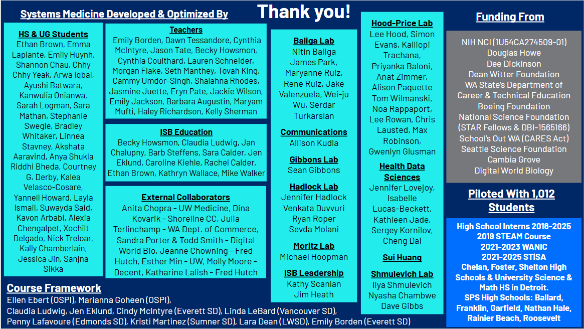 | For more information on the course visit https://isbscience.org/systems-medicine-education/. To field test and receive the draft curricular materials for any and all modules, or for any questions, please contact the team at see@isbscience.org. |